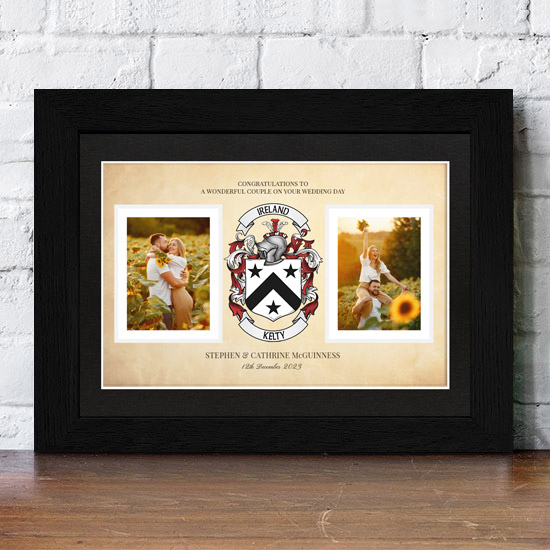 The Coat of Arms Wedding Gift with 2 photos Framed Print is a beautiful and personalised print that consists of the couple’s family crests or coat of arms with 2 photos. The product is printed on quality paper. We verify in our record books to ensure authenticity. We will locate the earliest version of the coat of arms on our records and our designers will recreate the crest for you.