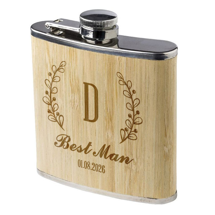 A thoughtful and stylish way to thank your Best Man on your special day. This personalised bamboo hip flask features a classic engraved design with an initial, elegant detailing, and the title “Best Man”, finished with your chosen wedding date.