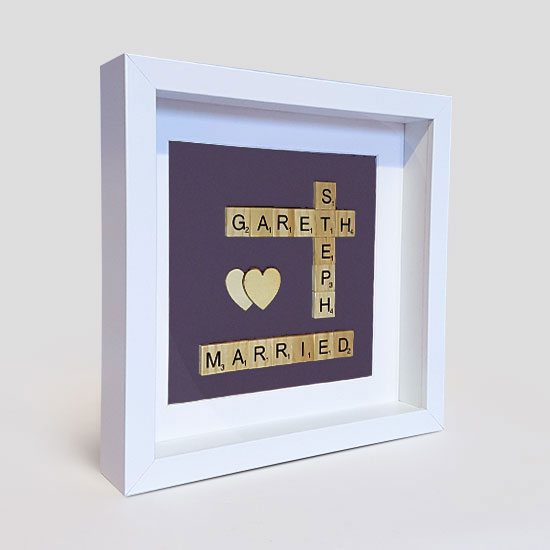Celebrate a love story with our Scrabble Wedding Gift, a timeless keepsake piece made with real scrabble tiles and wooden hearts. Each frame is tailored to your wording, connecting names with meaningful words like Love, Married, Together, or Mr & Mrs. Whether displayed on a shelf or hung on a wall, it is sure to become a cherished reminder of a special day.