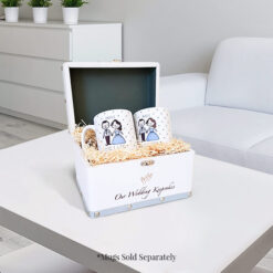 Stunning, Wedding Day Keepsake Box, Bound in White and Grey Faux Leather, Polished Metal Buttons, Handles & Clasp. Often combined with a set of personalised mugs for a really cute gift set. Please note: Mugs NOT included. PRODUCT DIMENSIONS:140 h 225 w 165 d